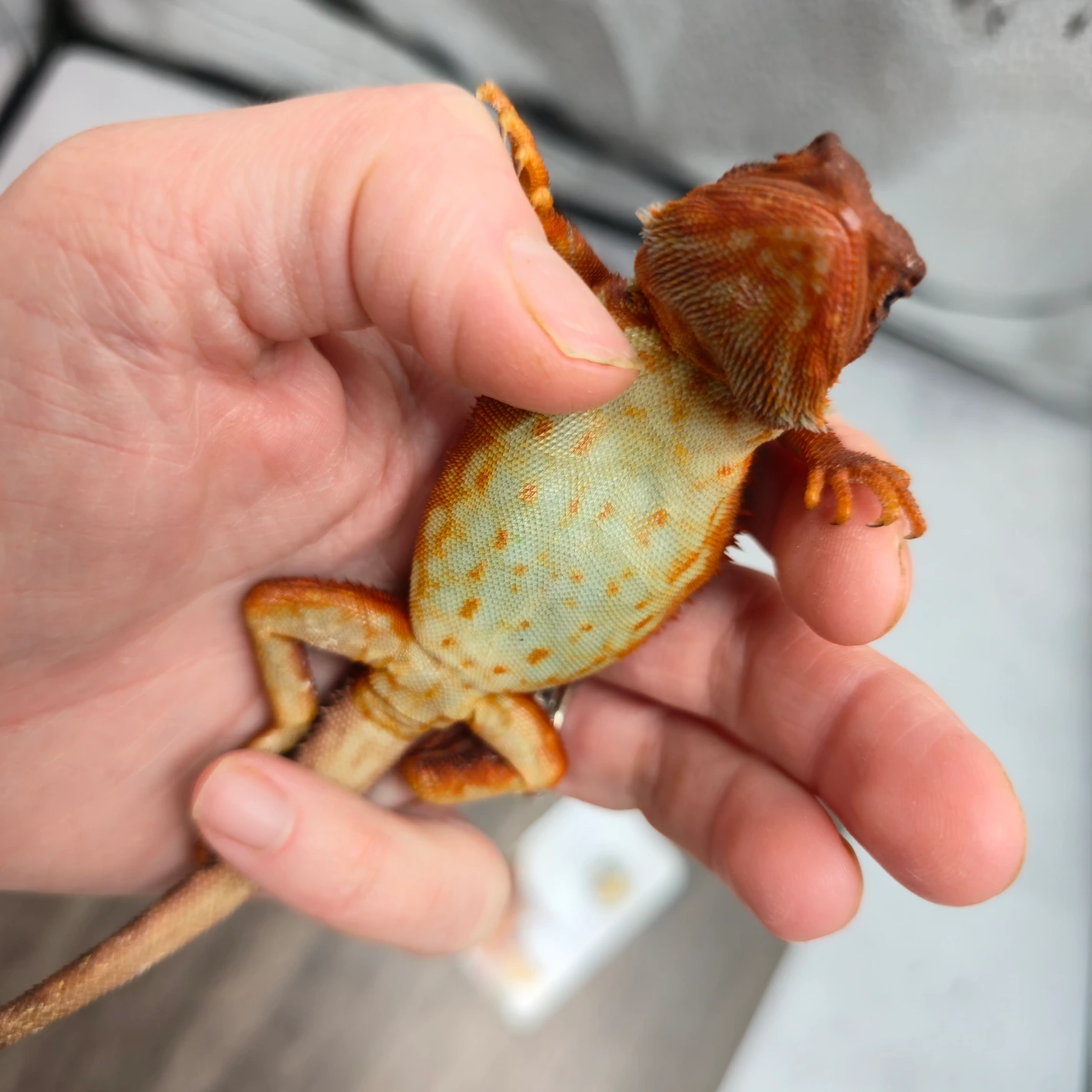 Awesome looking 50% Red Monster / Tiger. (Nose /face in shed). Such a cool pattern on this girl! She’s eating and developing well. Would make a great pet or potential breeder. Ready for her forever home! Message us with any questions. Thanks for stopping by! 👋 – DOB: 7-15-25 – Sex: Female ♀️ – Weight: 130grams (estimate) ⚖️ – FREE SHIPPING! ✈️ – Live arrival guarantee 🦎 – Ships overnight to your local FedEx hub – Must be able to pickup from FedEx hub – Deposit to hold (Non refundable) – Dragon remains available and can be sold if deposit isn’t made.🚫 – MorphMarket buyer protection 🛡️